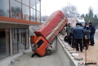 20 годишния Марин Гогов Младенов от хасковското село Горно Войводино зрелищно се заби с камиона си в новопостроен комплекс на завоя от Булевард „Освобождение“ към булевард Илинден. До сблъсък не се стигна след като камионът само хлътна в подстъпите си към сградата и застана почти вертикално за кеф на десетките зяпячи. Няма пострадали.