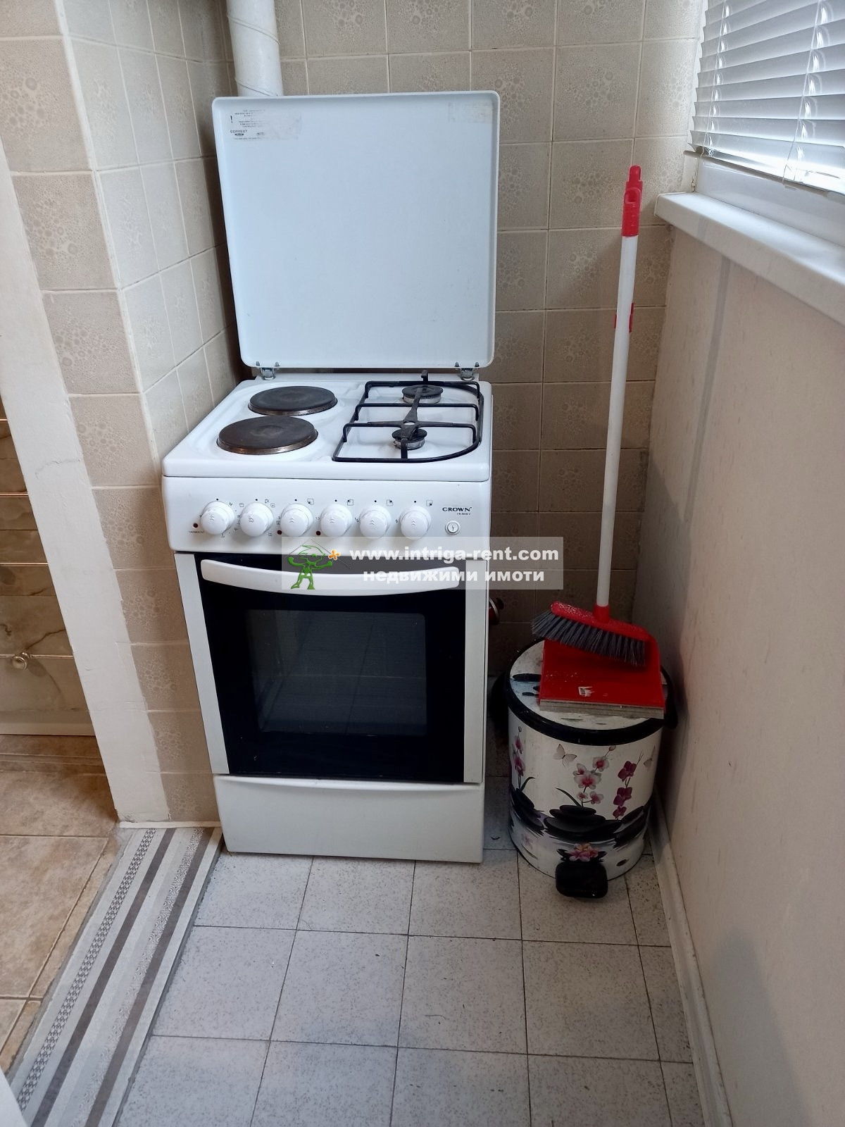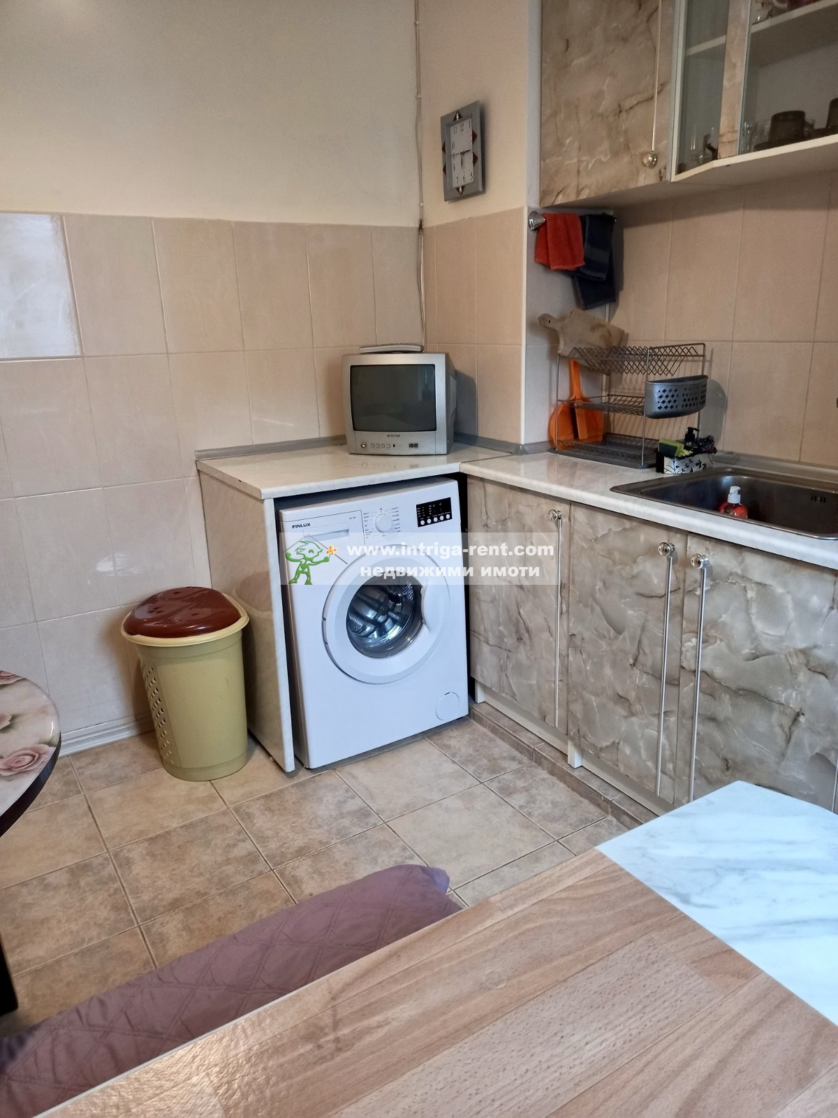 - кухня: трайна монтирана кухня, пералня, готварска печка с котлони, абсорбатор, малък телевизор, хладилник с фризерна част, малко канапе с масичка