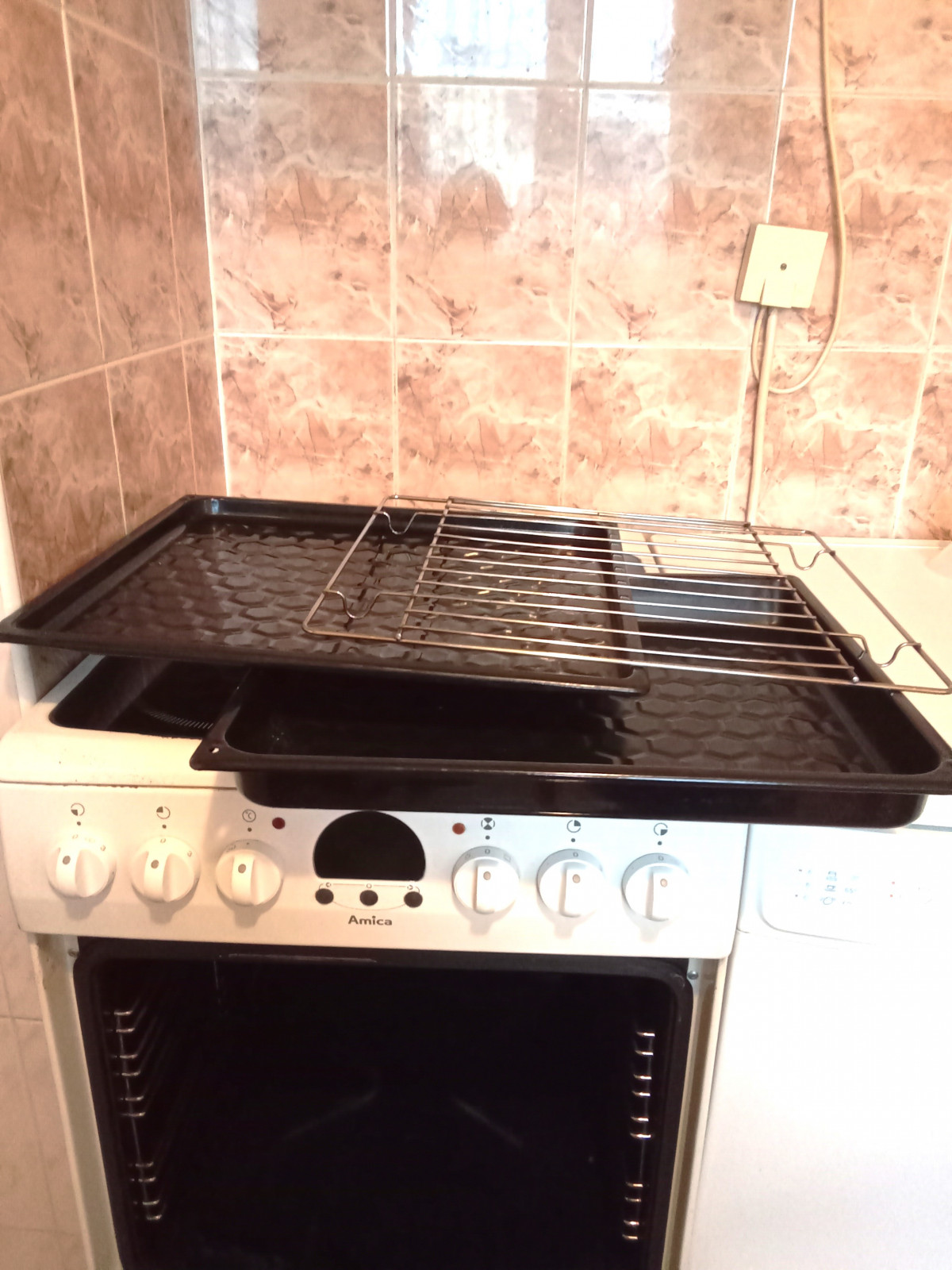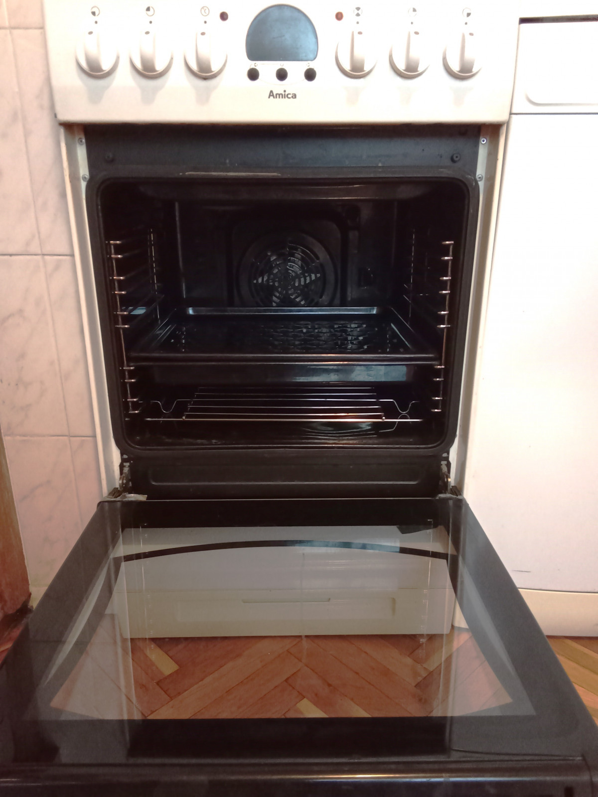 Готварска печка Amica с керамични котлони, вентилатор, две тавички и решетка, долно чекмедже. Състояние - използвано. 140 евро