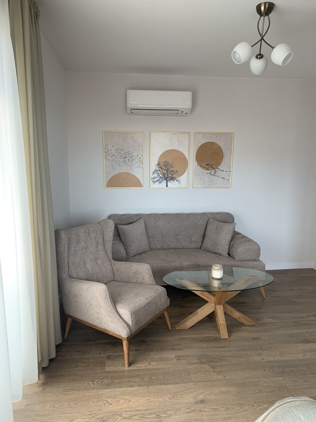 Апартаментът е чисто нов, необитаван, изпълнен в модерен стил с внимание към всеки детайл. Интериорът е решен в топли неутрални тонове, съчетани с модерни акценти и функционално разпределение, което създава усещане за комфорт и простор.
