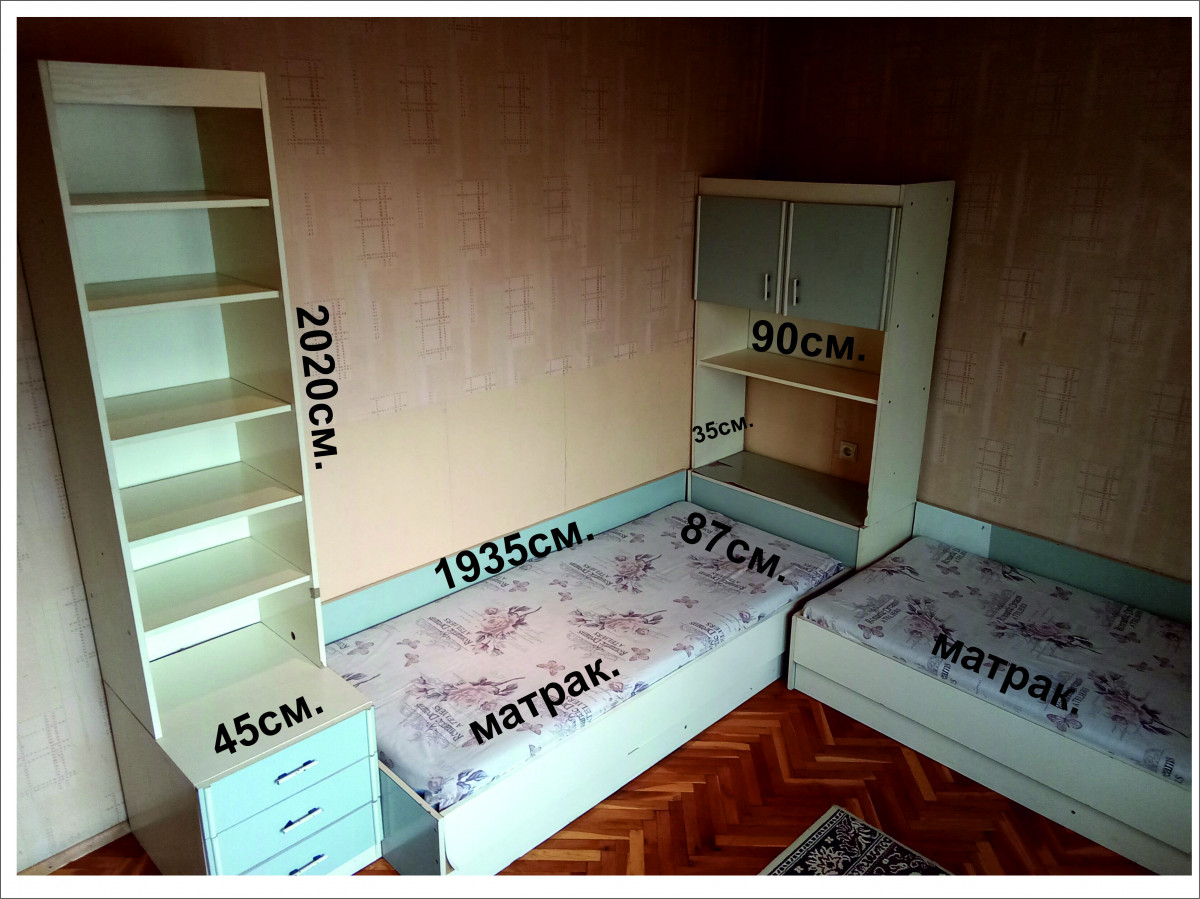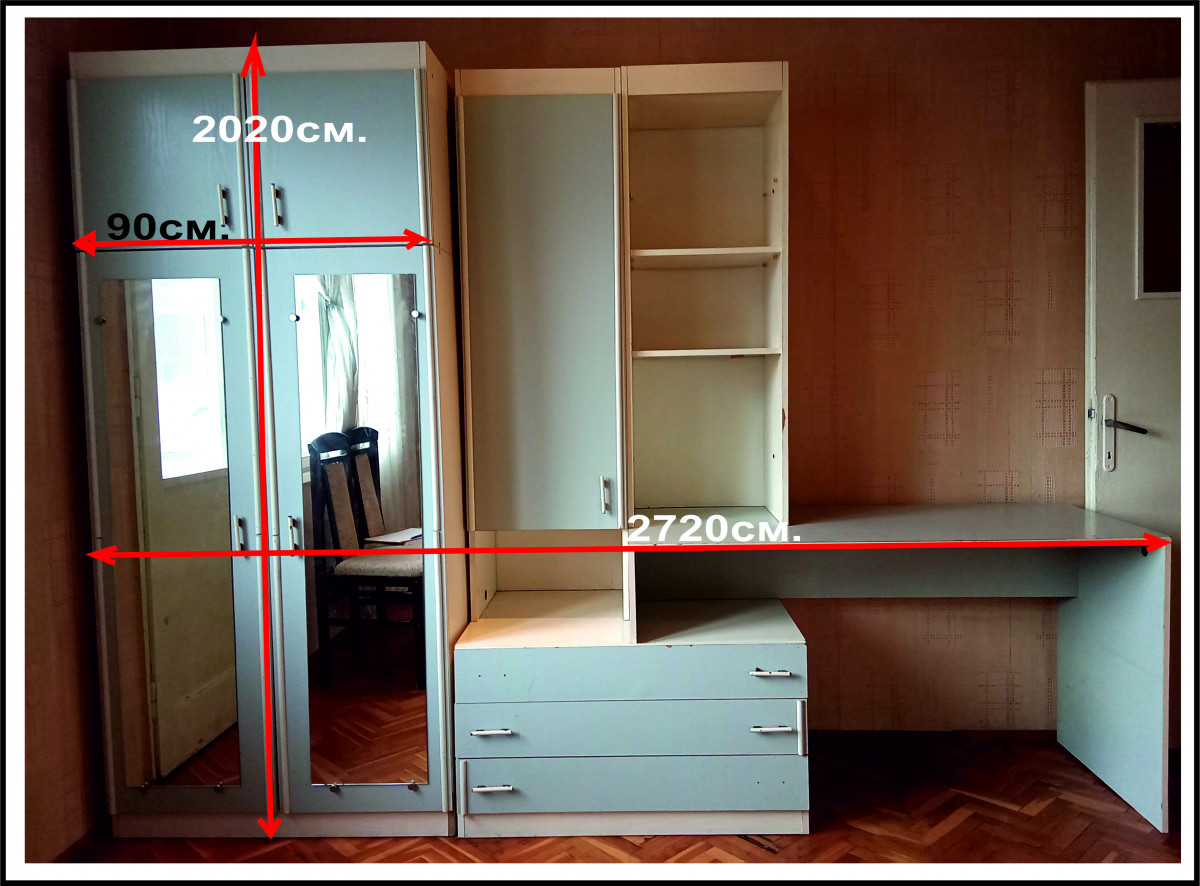 Гардероб, секция със чекмеджета, бюро, 2 легла с матраци и две секции - има следи от употреба. Изнасянето на мебелите е за Ваша сметка.