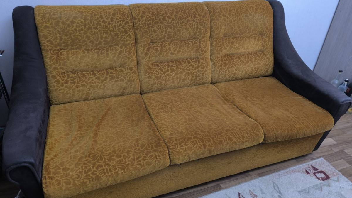 Холова гарнитура (диван тройка с разтегателен механизъм + подарък диван двойка). С дунапренен дюшек и нови подлакътници и на двата дивана с тъмно кафява дамаска.