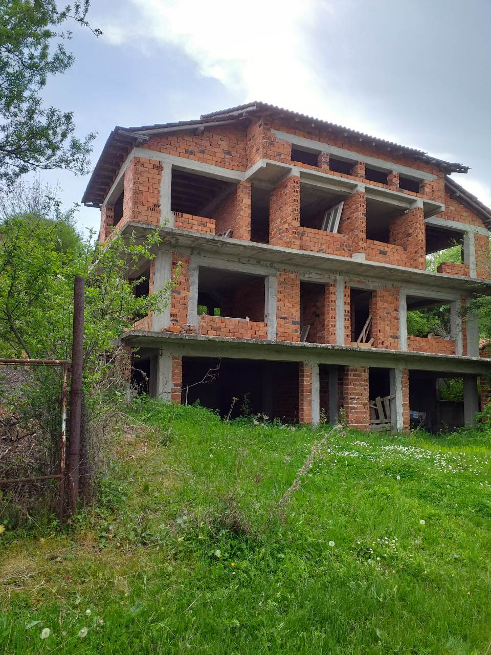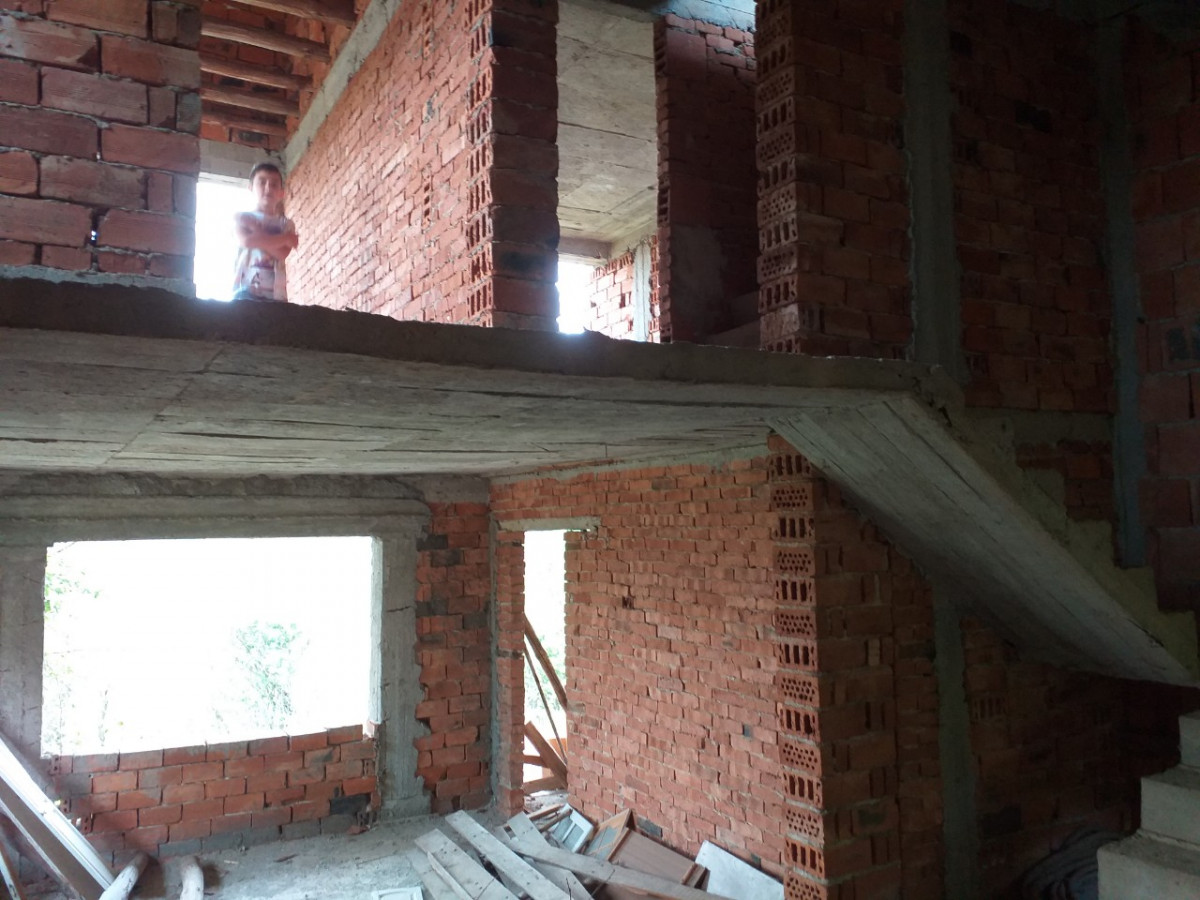 Къщата е на калкан (близнак)с два входа, незавършен на груб строеж. Идеална е за две семейства.