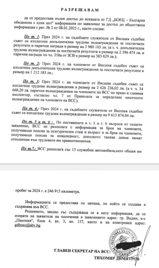 Още по-скандално е, че ВСС разполага с 13 служебни автомобила, които са направили пробег за 2024 г. от 247 000 км.