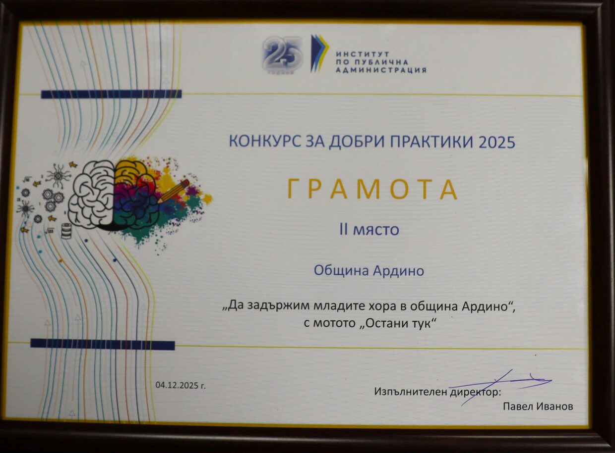 Община Ардино бе класирана на второ място в Конкурса за добри практики за 2025 година, организиран от Института по публична администрация. Отличието е присъдено за практиката „Да задържим младите хора в община Ардино“, реализирана под мотото „Остани тук“.