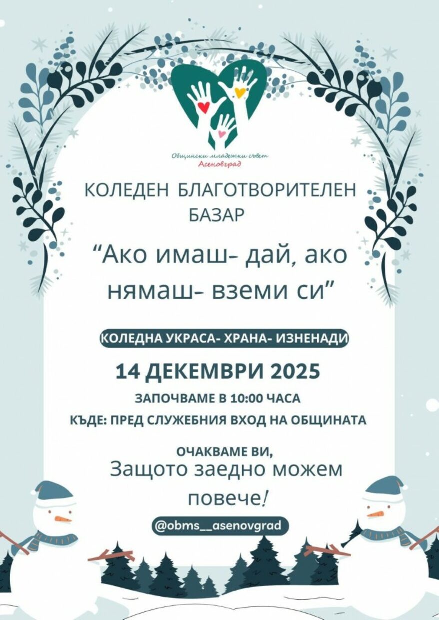 Коледен благотворителен базар на Общински младежки съвет – Асеновград. "Ако имаш - дай, ако нямаш - вземи си" се провежда за поредна година и е част от Коледно-Новогодишните празници на община Асеновград.