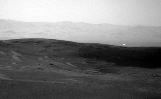 Космически лъч или най-бързият извънземен космически кораб в космоса, се спусна на 2438-ия марсиански ден. Кредит: Curiosity's Navcam Right B. NASA/JPL-CaltechМарсоходът Curiosity на НАСА изглежда е успял да заснеме загадъчна светлина на Марс. Снимката, която показва светлина, сякаш плаваща над повърхността на планетата, е направена на 16 юни, или 2438 сол - 2438-ия марсиански ден на мисията Curiosity, изследваща Червената планета. Марсианските денонощия, наречени "сол" и продължават 24 часа, 39 минути и 35 секунди, което означава, че една година - или една орбита около Слънцето - е 668 сола (или 687 денонощия). Кредит: Curiosity's Navcam Right B. NASA/JPL-Caltech