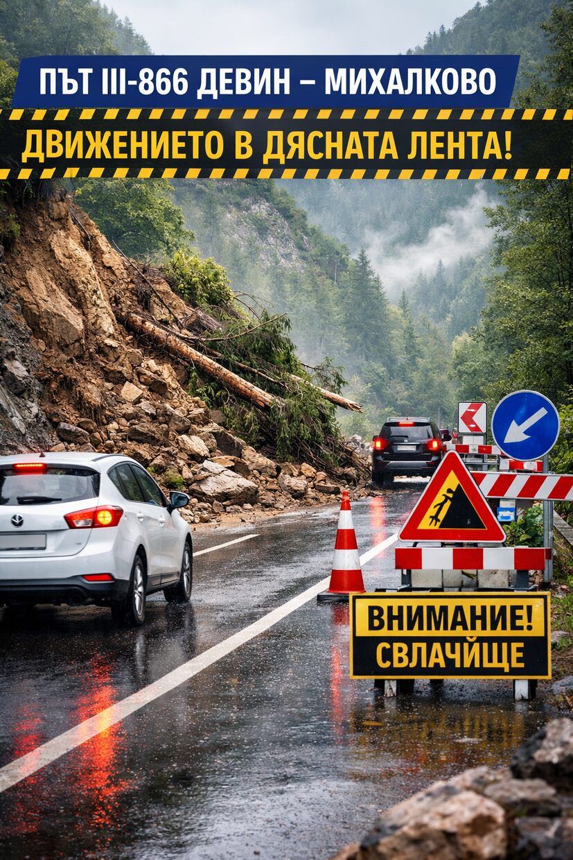 Временно е ограничено движението по път III-866 Девин – Михалково в района на км 50+800 поради свлечена земна маса, съобщиха от Областно пътно управление – Смолян. Свлачището включва и паднали дървета, което налага преминаването на автомобилите само в дясната пътна лента. Участъкът е сигнализиран с необходимите пътни знаци, като движението се осъществява с повишено внимание. От пътната служба призовават водачите да спазват въведената временна организация и да се съобразяват с пътната обстановка. Не е посочен срок за пълното възстановяване на движението, като екипите следят ситуацията и ще предприемат необходимите действия за обезопасяване на трасето.