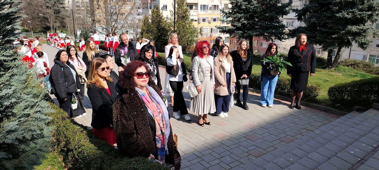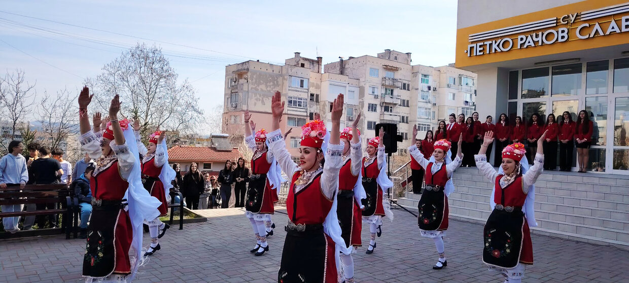 В 10.30 ч. на 26 март гостите бяха официално посрещнати в училищния двор. За тях бяха строени в параден ред малките мажоретки от Танцов състав „Мистерия“, чийто наставници са Тонка Димитрова и Весела Василева. Те дефилираха под звуците на училищния химн. Със стъпките на българския народен танц пък приветстваха гостуващите изпълнителките от Танцов състав „Шампионски ритъм“, с ръководител Лора Колева. Представителите на Ученическия парламент очакваха гостите на входа. Там председателят Мария Муканова, произнесе кратък, но вдъхновен поздрав и ги покани да пристъпят прага на учебното заведение. Последва „туристическа“ разходка из училищните пространства. Домакините с гордост показаха красивите кътове с ликовете на възрожденци и будители, и на патрона на училището, Еврокоридора, фоайето с безбройните купи, медали и отличия, учителската стая, кабинетите по БЕЛ и История, по Математика и STEM-центъра, както и класни стаи.