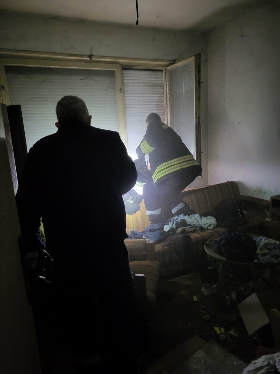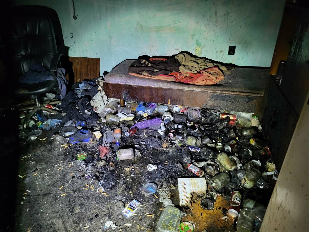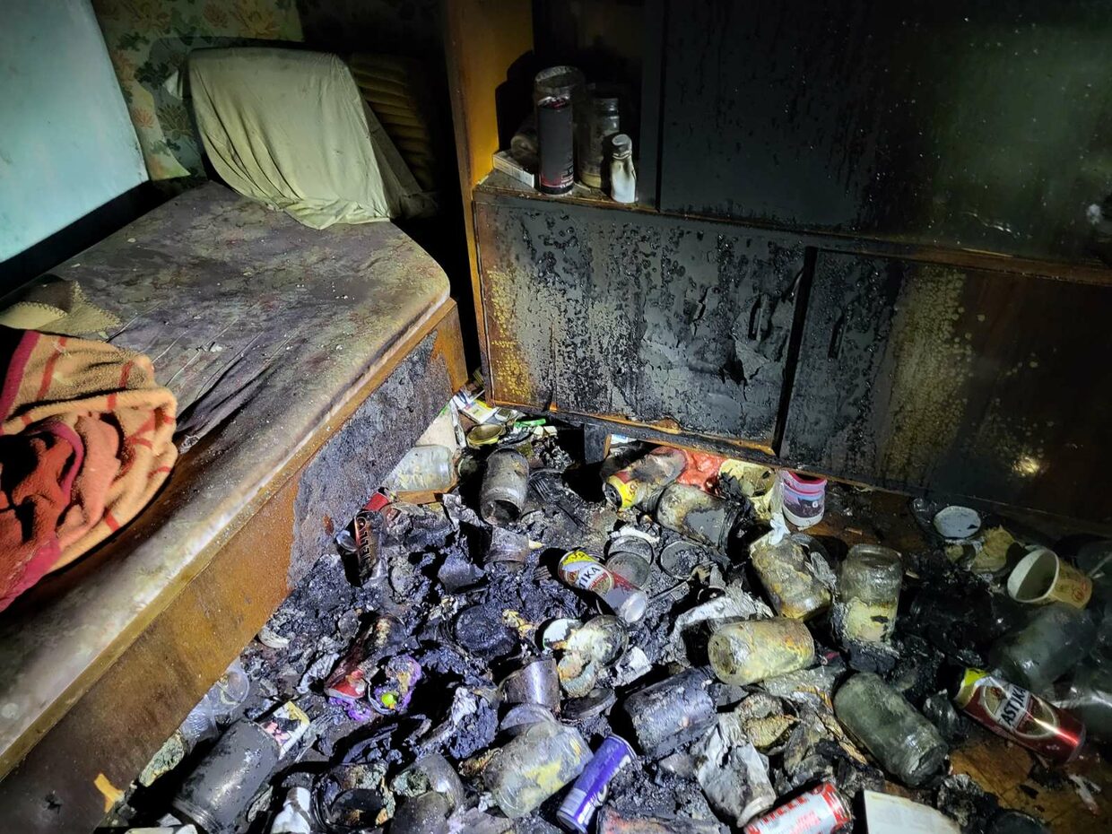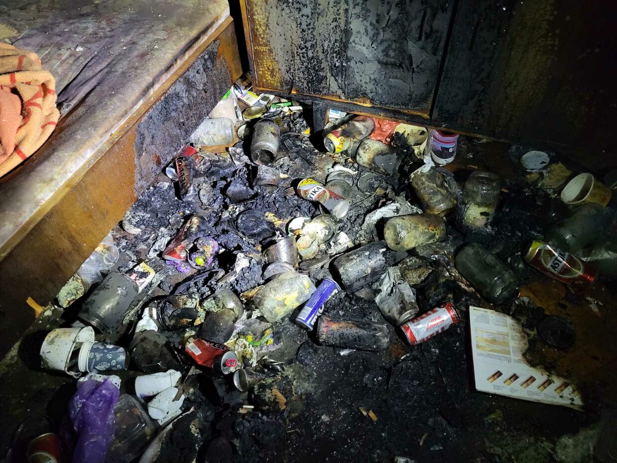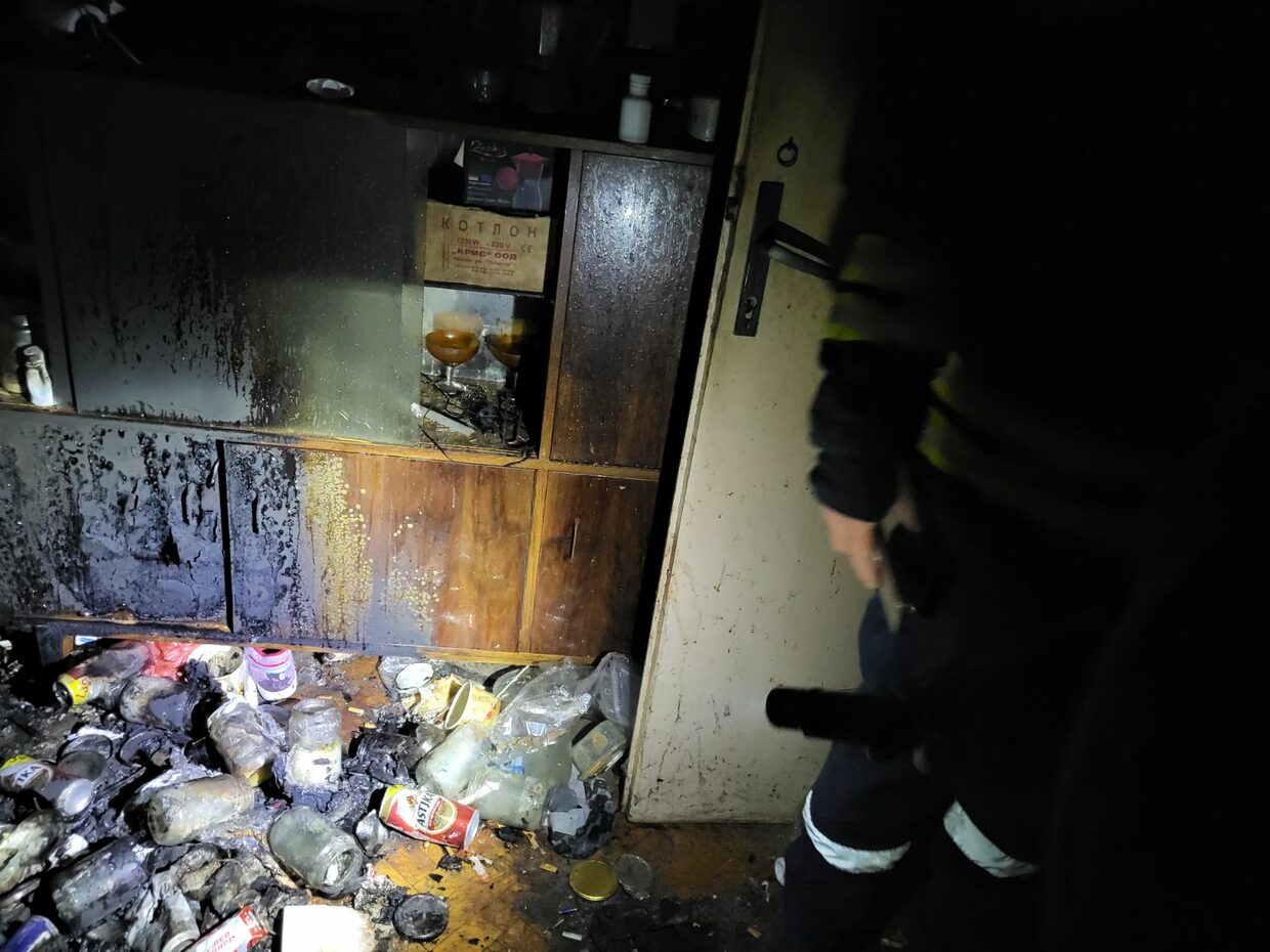 Опушени са стените в апартамента, обгорели са легло, шкаф и разпилени по земята отпадъци – кенчета от бира, безалкохолни, празни стъклени буркани,  празни шишета от алкохол, фасове, недоядена храна. Видимо обитателят е гасил огъня сам.