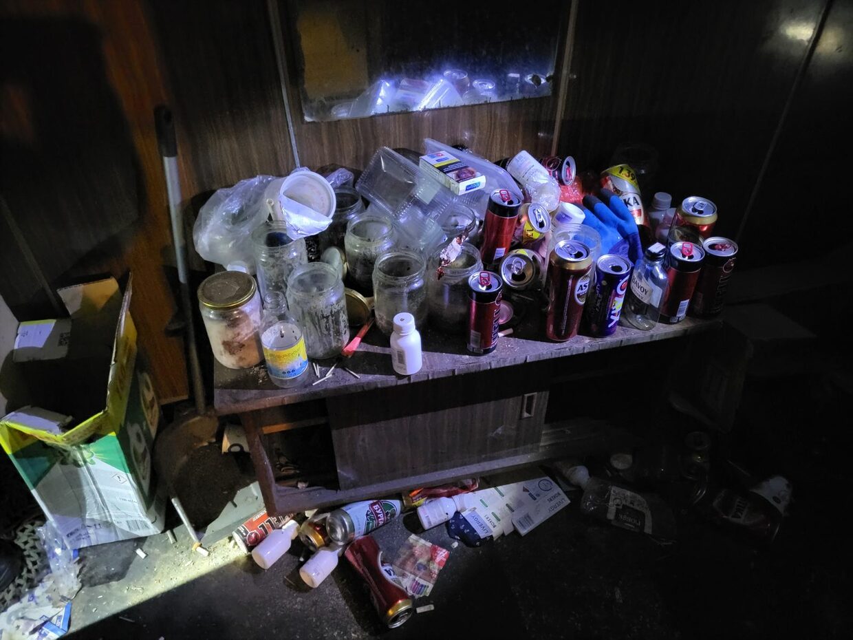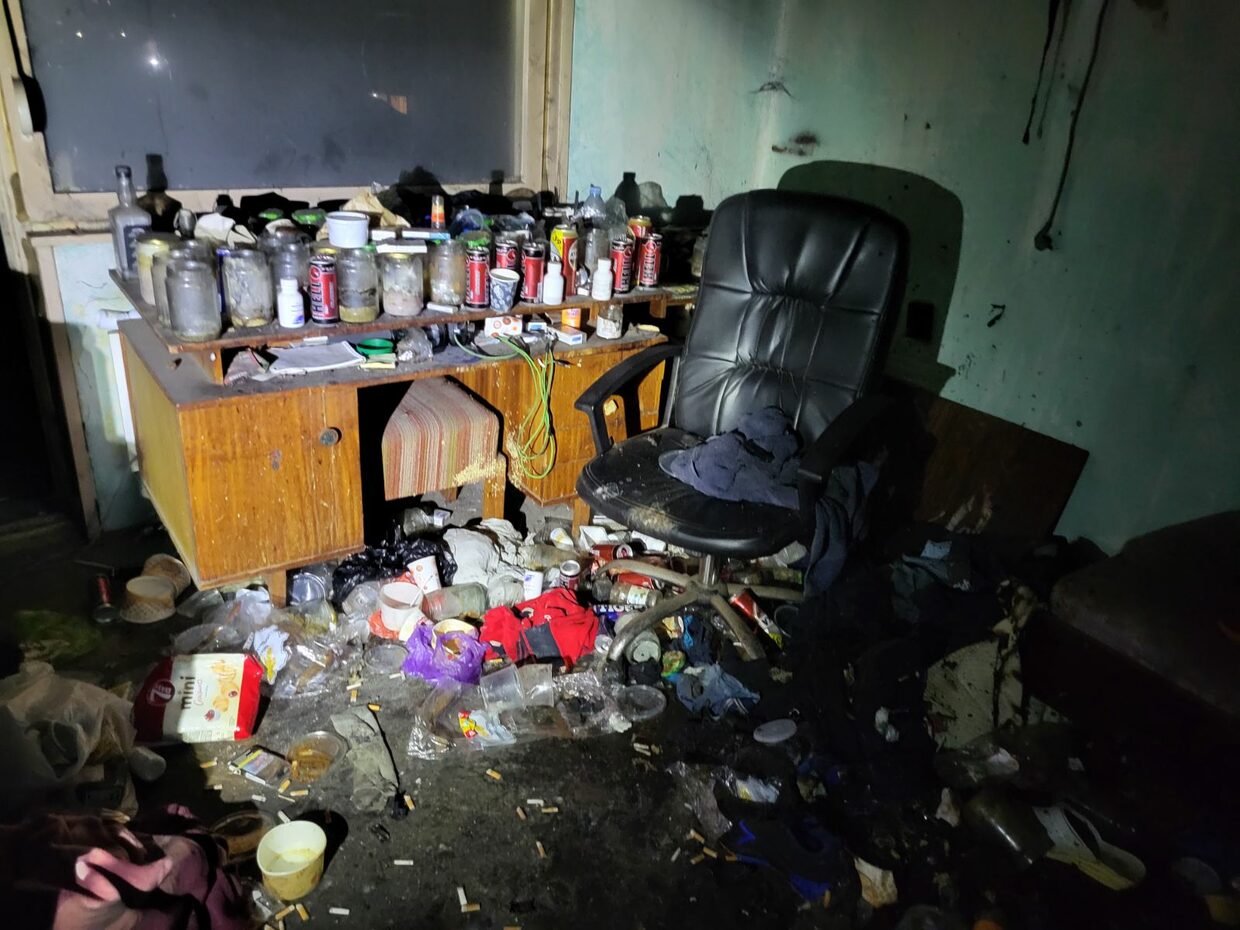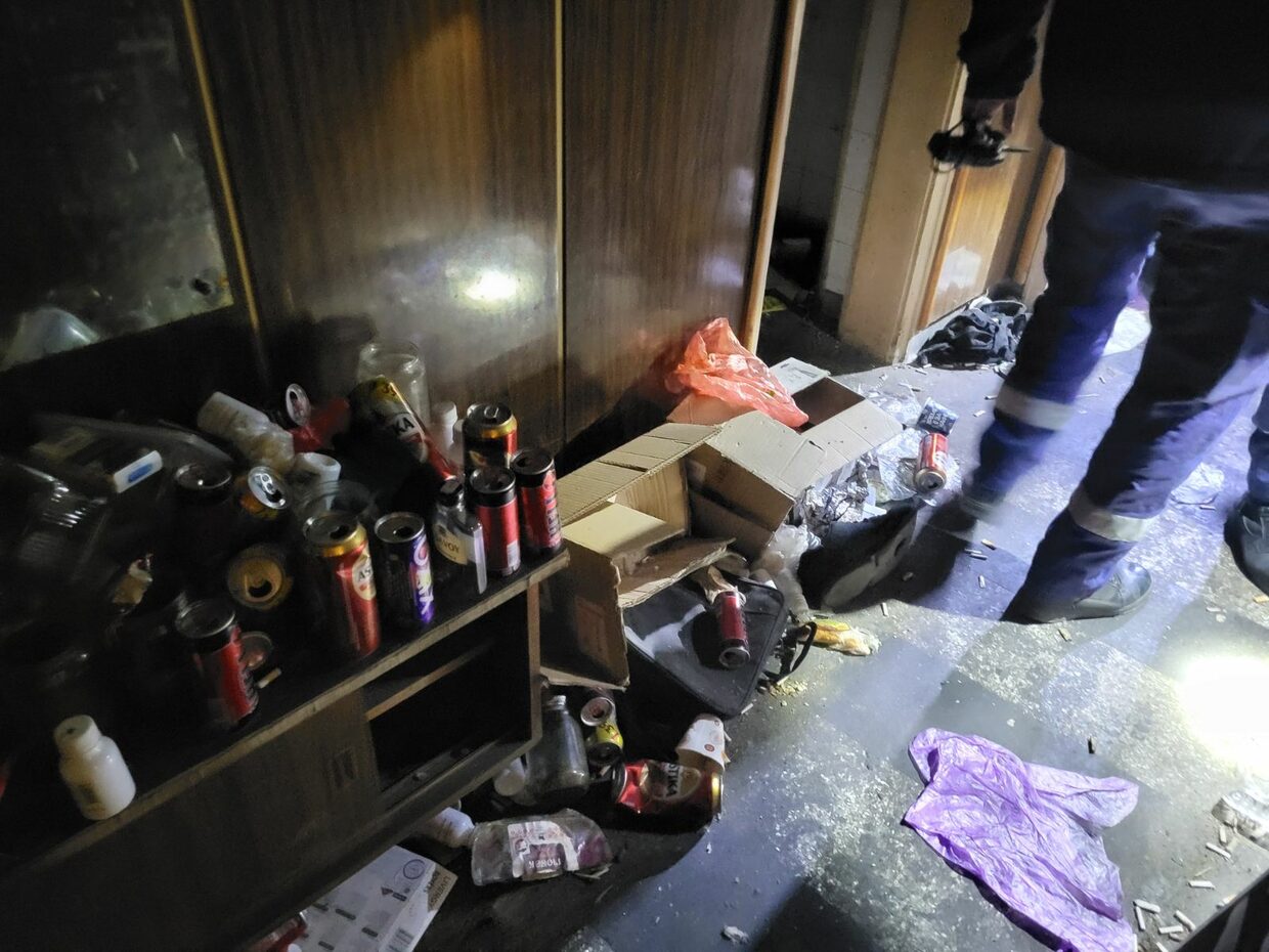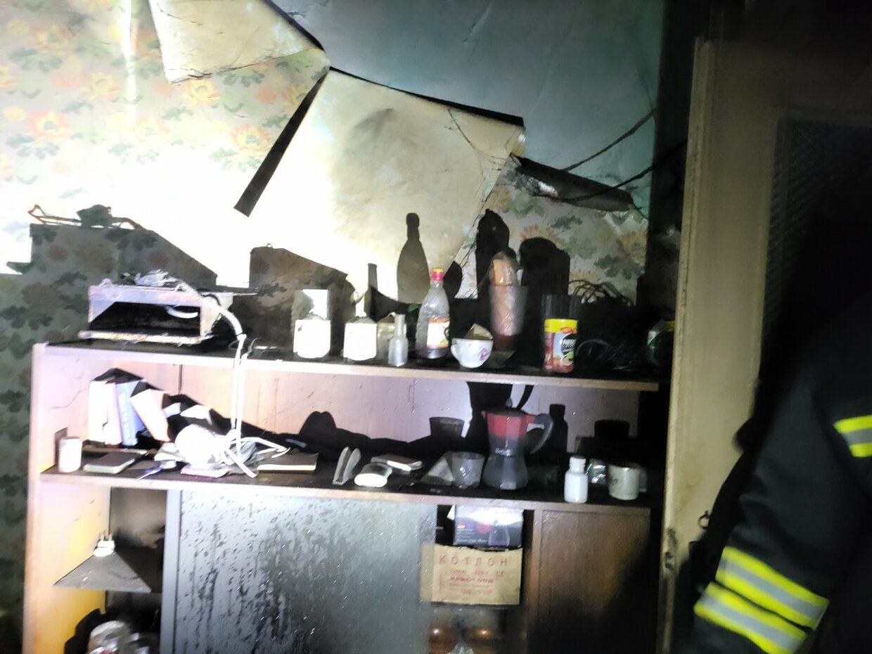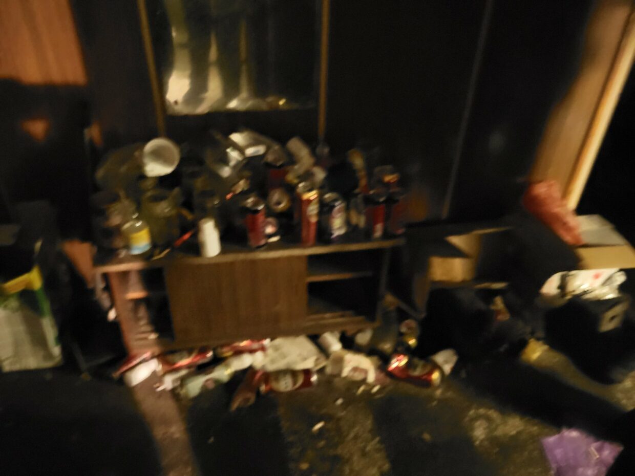 Опушени са стените в апартамента, обгорели са легло, шкаф и разпилени по земята отпадъци – кенчета от бира, безалкохолни, празни стъклени буркани,  празни шишета от алкохол, фасове, недоядена храна. Видимо обитателят е гасил огъня сам.