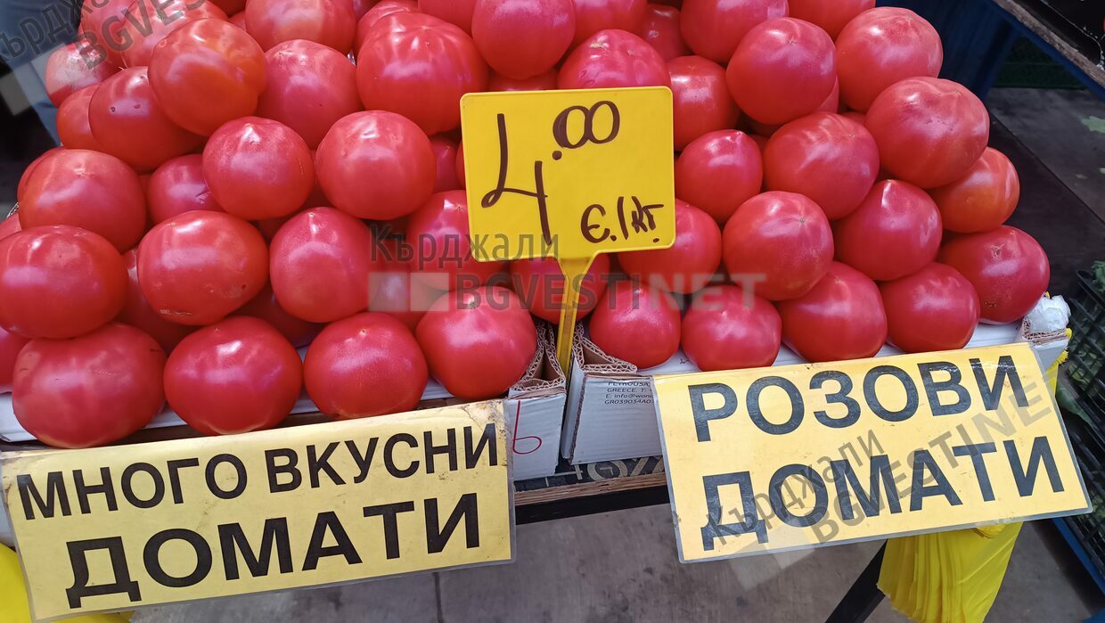 Българските розови домати се  търгува се на нива от 4,20 евро/кг (около 8,20 лв.) на сергиите на Пазара, като в централните магазини може да достигне до 6,00 евро/кг (близо 11,70 лв.).