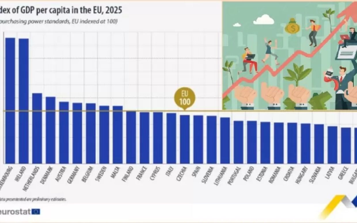 Именно това сочат данните на Евростат за 2025 г.  - България, Гърция и Латвия са на дъното в ЕС по показателя „брутен вътрешен продукт на човек“ с отчитане на покупателната способност. Прави впечатление класирането на Румъния, която вече е изпреварила не само нашата тройка, но и Унгария, Словакия и Хърватия. Испания, която според Георги Ангелов може да настигнем през идното десетилетие, е малко под средното за ЕС, също като Чехия и Словения.