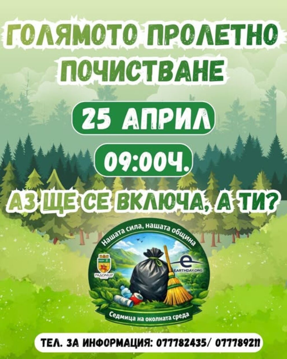 Пролетно почистване на 25 април – включи се!Община Радомир те кани да станеш част от най-мащабното почистване в рамките на инициативата “Нашата сила, нашата община” съвместно с EARTHDAY.ORG