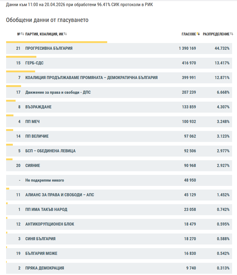 Към 11:00 часа на 20 април 2026 г., при обработени 98.75% от секционните протоколи в РИК, резултатите в област Хасково показват категорична победа за „Прогресивна България“, която получава 52 228 гласа или 49.69%. Това е с близо 5 процентни пункта над националния резултат на формацията, която към същия час събира 44.73% от вота в страната.