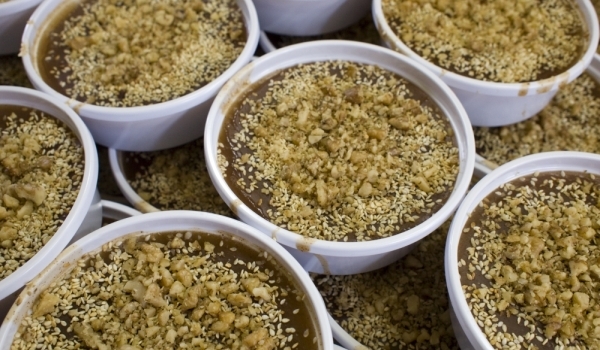 Подредете кадаифа в тавичка, като върху всяка сармичка поставите по малко орехови ядки. Кадаифът се пече до златисто, след което се залива с предварително приготвения захарен сироп от захарта и водата...