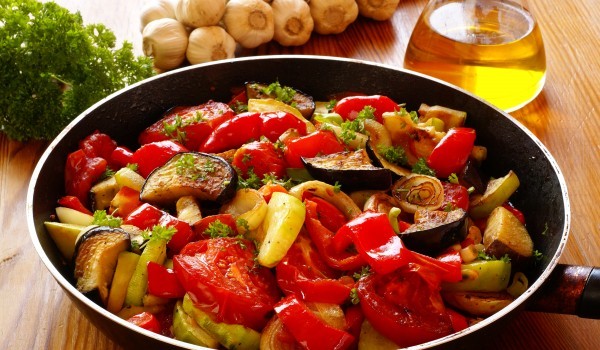 Измийте всички зеленчуци и ги нарежете на шайби. В тиган запържете първо патладжана, след това чушките, доматите, лука, тиквичките и чесънът. След това овкусете със солта и останалите подправките. З...