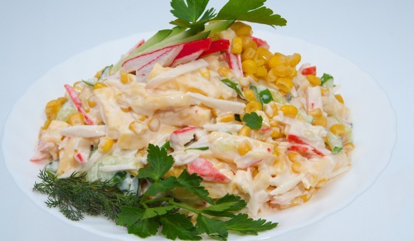 Картофите се нарязват на малки кубчета, рачешките рулца на тънки парчета по дължина. Омесват се с зелето и царевицата и салатата се залива със сос, приготвен от майонезата и сметаната, овкусен с малк...