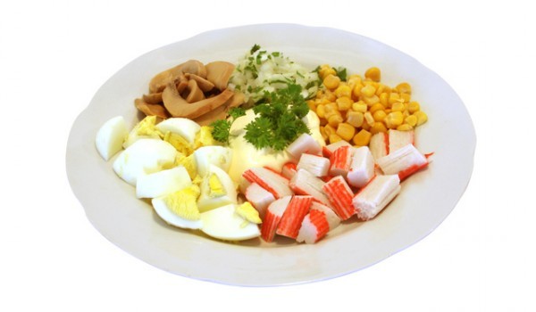 Оризът се сварява. Когато изстине, се смесва с нарязаните на малки кубчета: рулца от раци, свареното яйце и домата без семките. Всичко се разбърква добре, поръсва се с черен пипер и се залива с майоне...