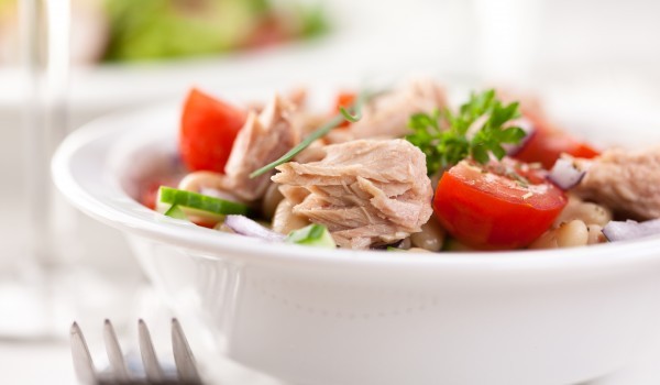Смесете рибата тон, нарязания червен лук, чушката и боба. Овкусете с винегрета, добавете магданоза, овкусете със сол и пипер. В 4 чинии наредете листа маруля и разпределете сместа отгоре. Гарнирайте...