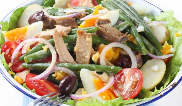 Зелената салата се измива и се разделя на листа, които се нареждат в чиния за сервиране. Картофите се обелват, нарязват на кубчета и заедно със зеления фасул се сваряват в подсолена вода. Отцеждат се...
