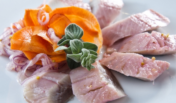 Картофите се сваряват, обелват се и се нарязват на кубчета. Рибата се нарязва на дребно. Яйцата се разрязват, изваждат се жълтъците и се намачкват с вилица. Смесват се с олиото, горчицата и черния п...