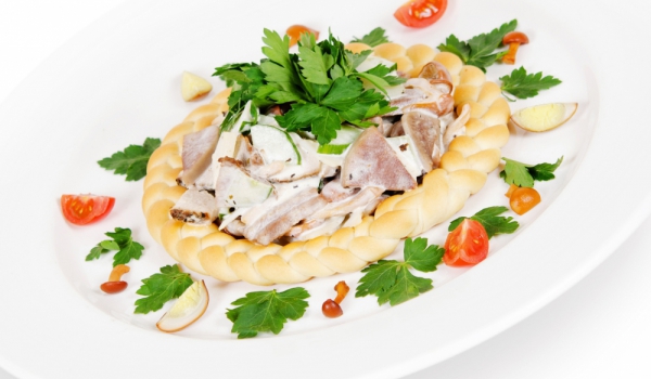 Месото се сварява до омекване и се нарязва на ситно. Гъбите и краставичките се нарязват на ситно. Картофите се сваряват, обелват се и се нарязват на кубчета. Добавя се сол и майонеза и се разбърква....