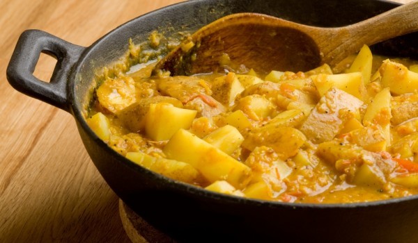 В сгорещеното олио леко запържваме счукания чесън, джинджифила, кориандъра и куркумата. Прибавяме картофите, нарязани на малки кубчета и нарязаната парченца шунка. Разбъркваме. Заливаме с водата, в ко...