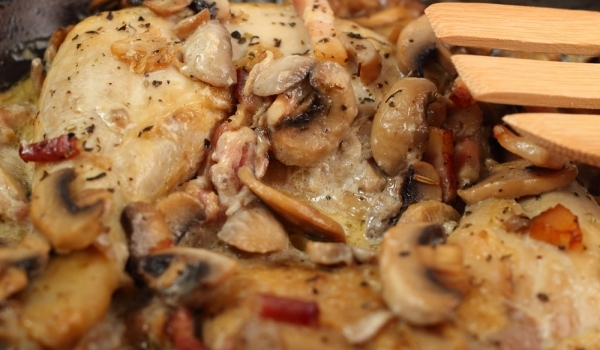 Нарежете пилешкото филе на жулиен, овкусете със сол, черен пипер и сложете в тиган, на котлон да се запържва. През това време нарежете гъбите, краставичките и маслините. Добавете ги към месото, продъл...