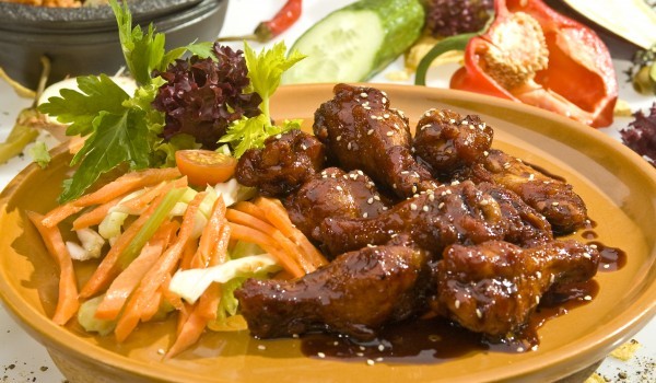 Загрейте зехтина в тиган, оваляйте посолените пилешки бутчета в брашно и ги изпържете равномерно от всички страни. Щом са готови излейте соевия сос в тигана и добавете чесъна на прах, черния и червен...